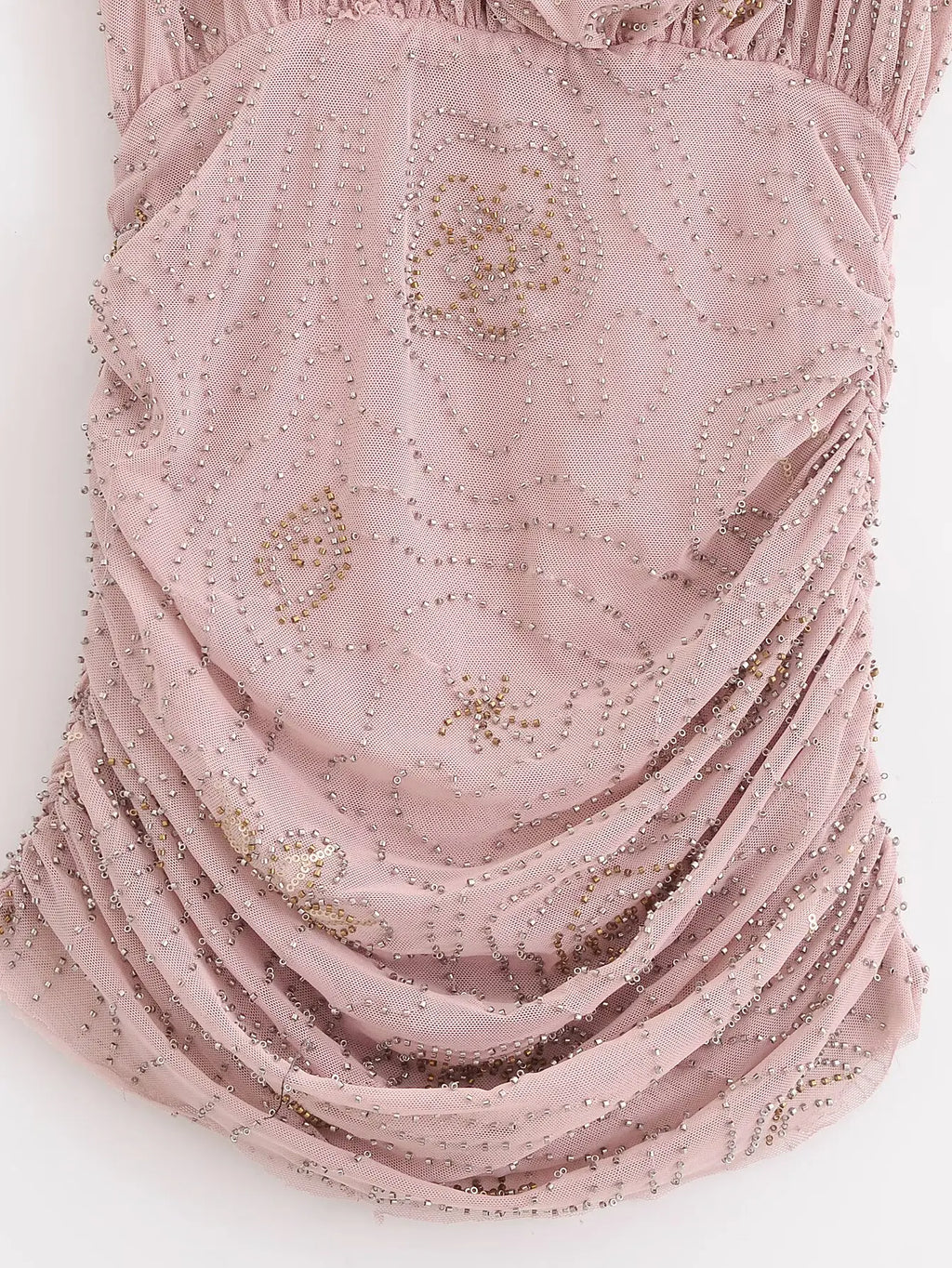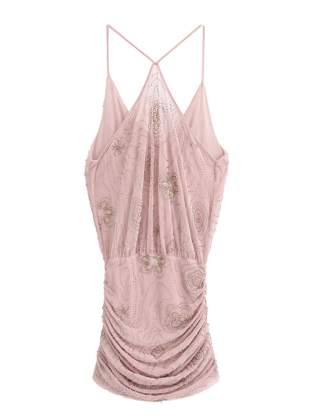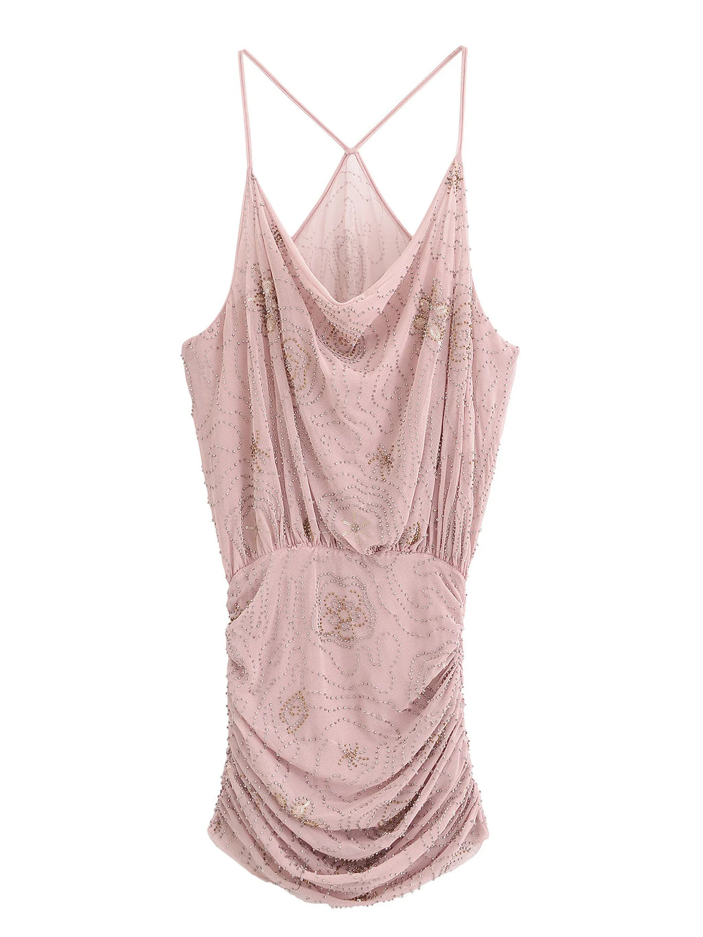 A statement mini dress with a draped cowl neckline, delicate all-over beading, and ruched detailing that hugs the body for a sleek, party-ready silhouette.