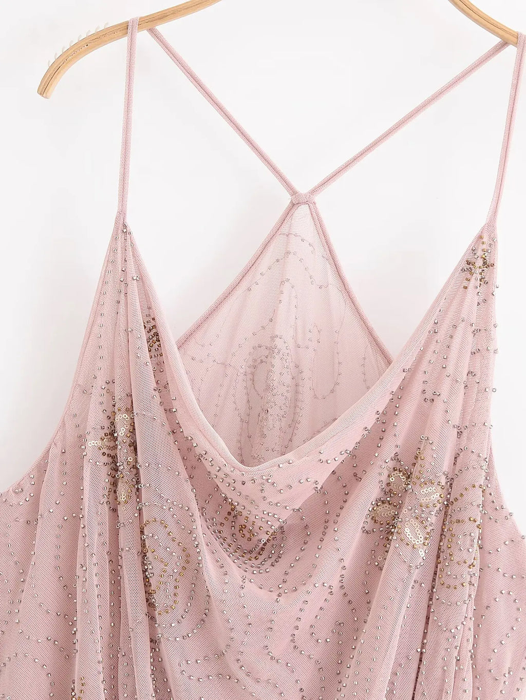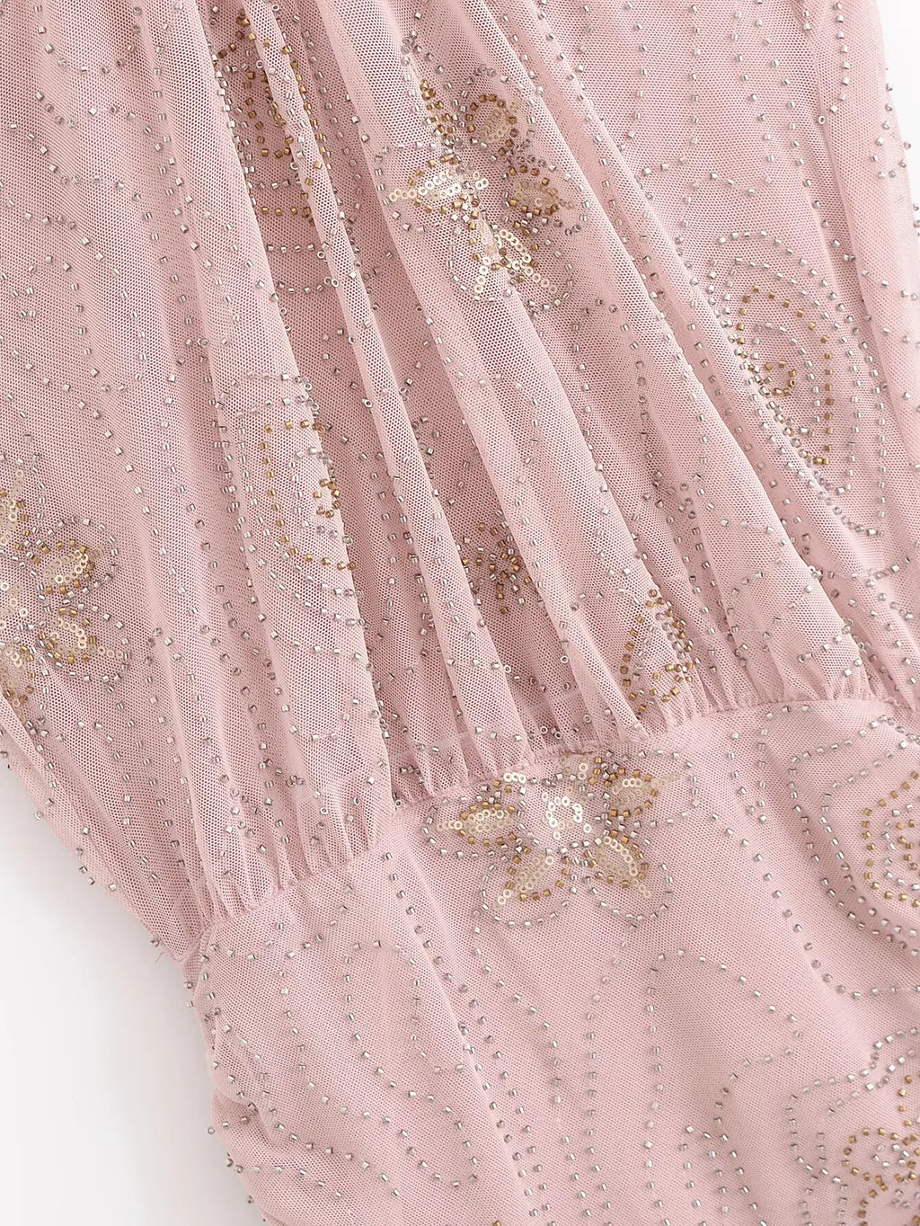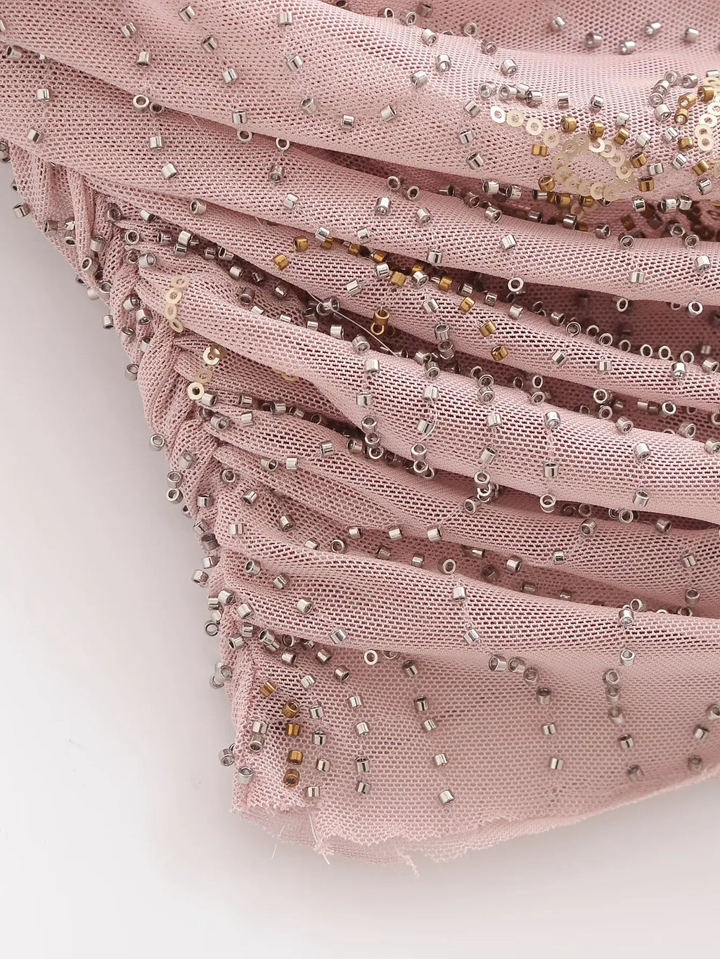 A statement mini dress with a draped cowl neckline, delicate all-over beading, and ruched detailing that hugs the body for a sleek, party-ready silhouette.
