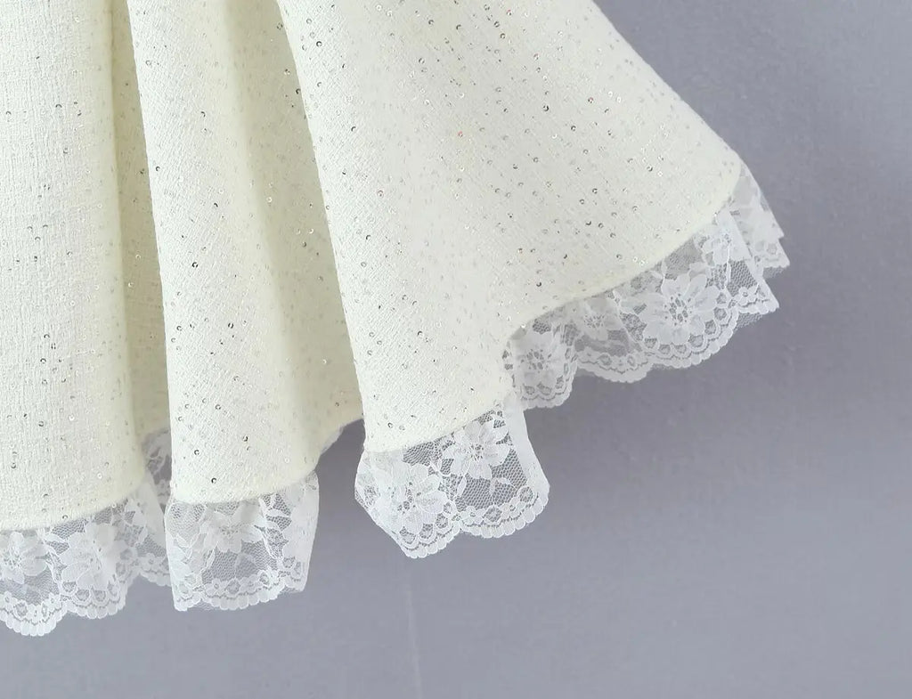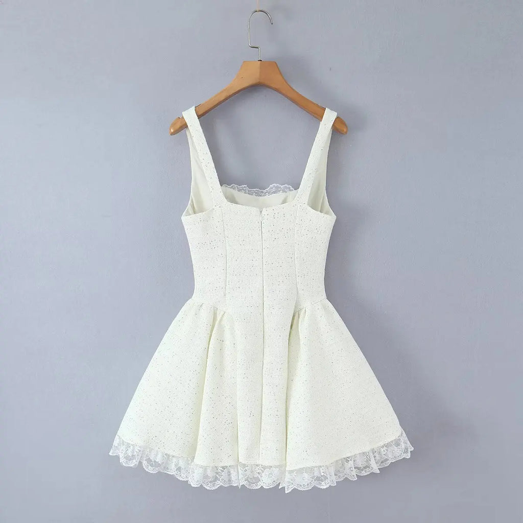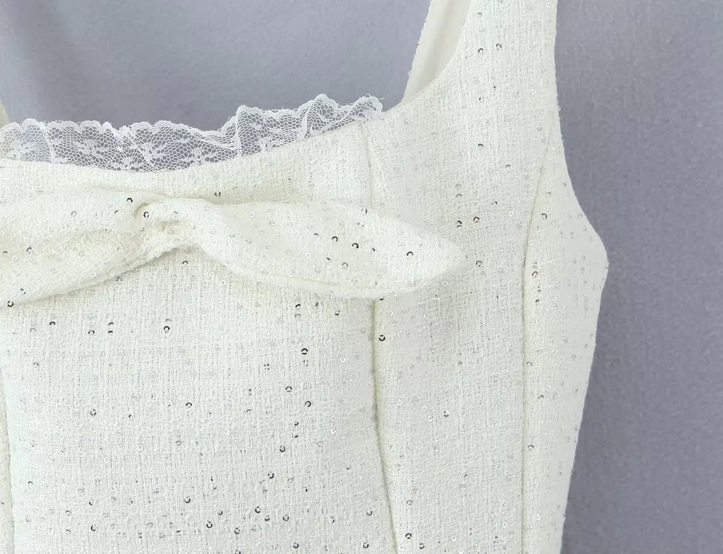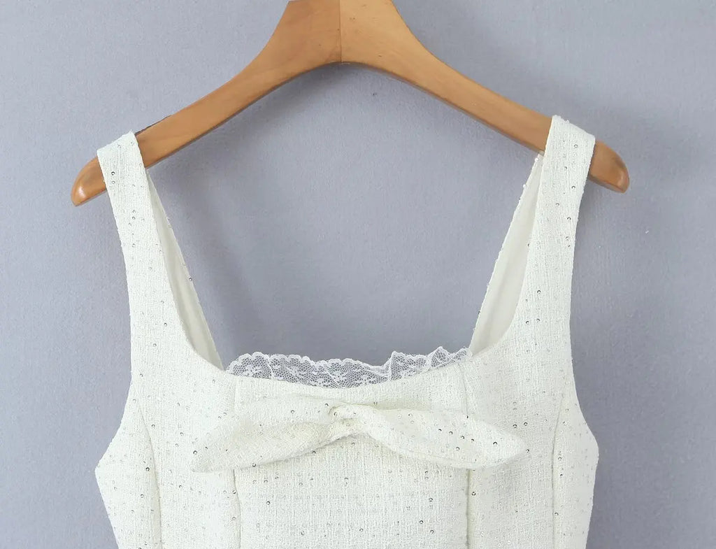 A feminine bow-detail mini dress with a structured bodice and a flared skirt finished with delicate lace trim. Perfect for date nights, parties, and elevated day looks.