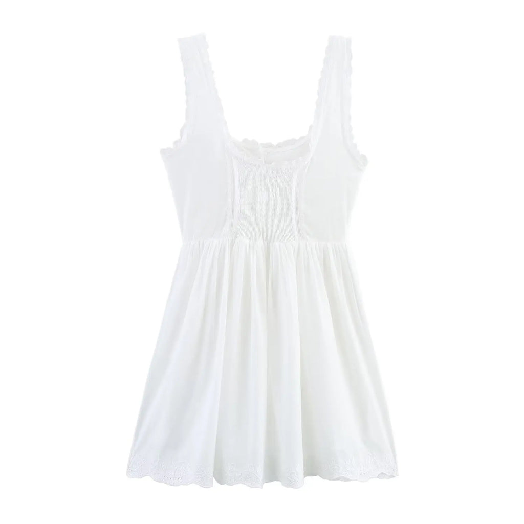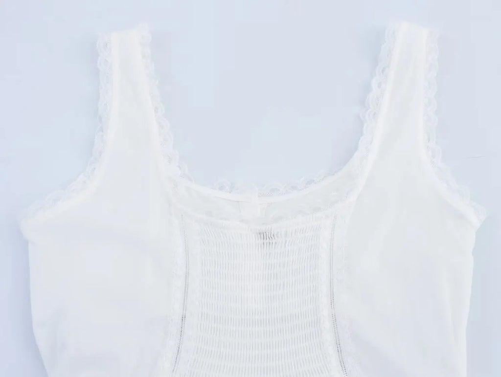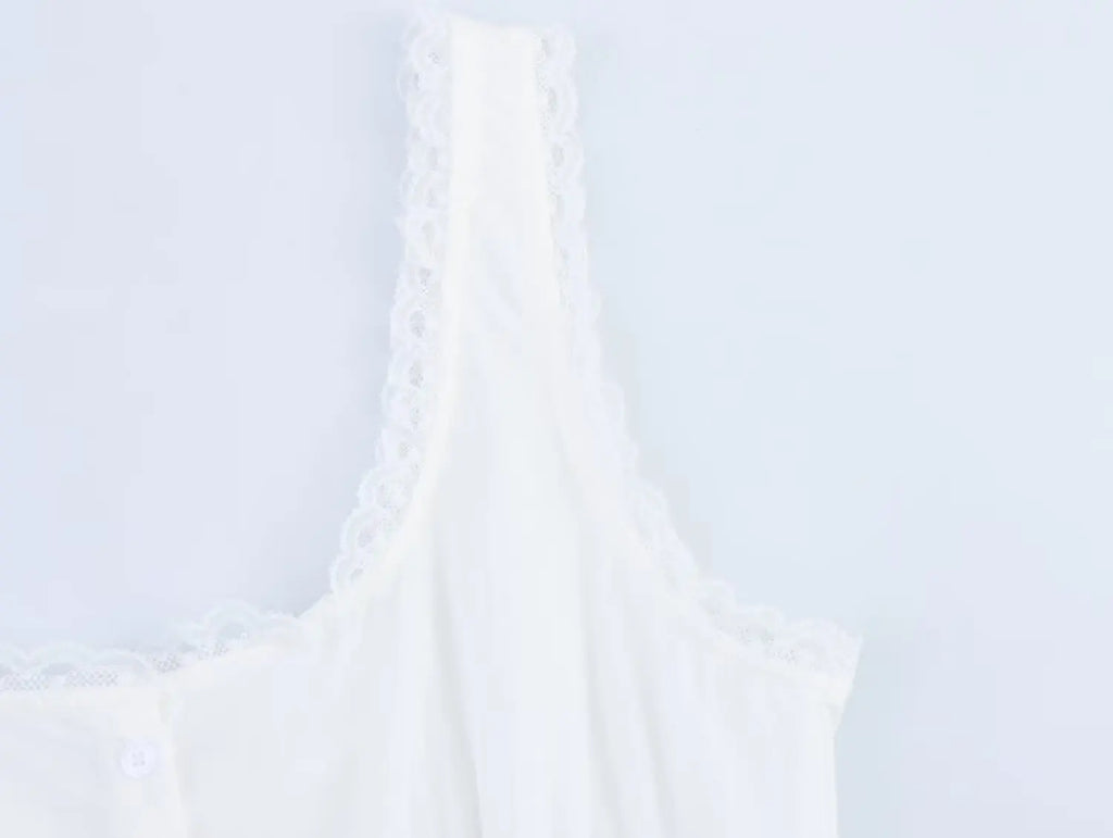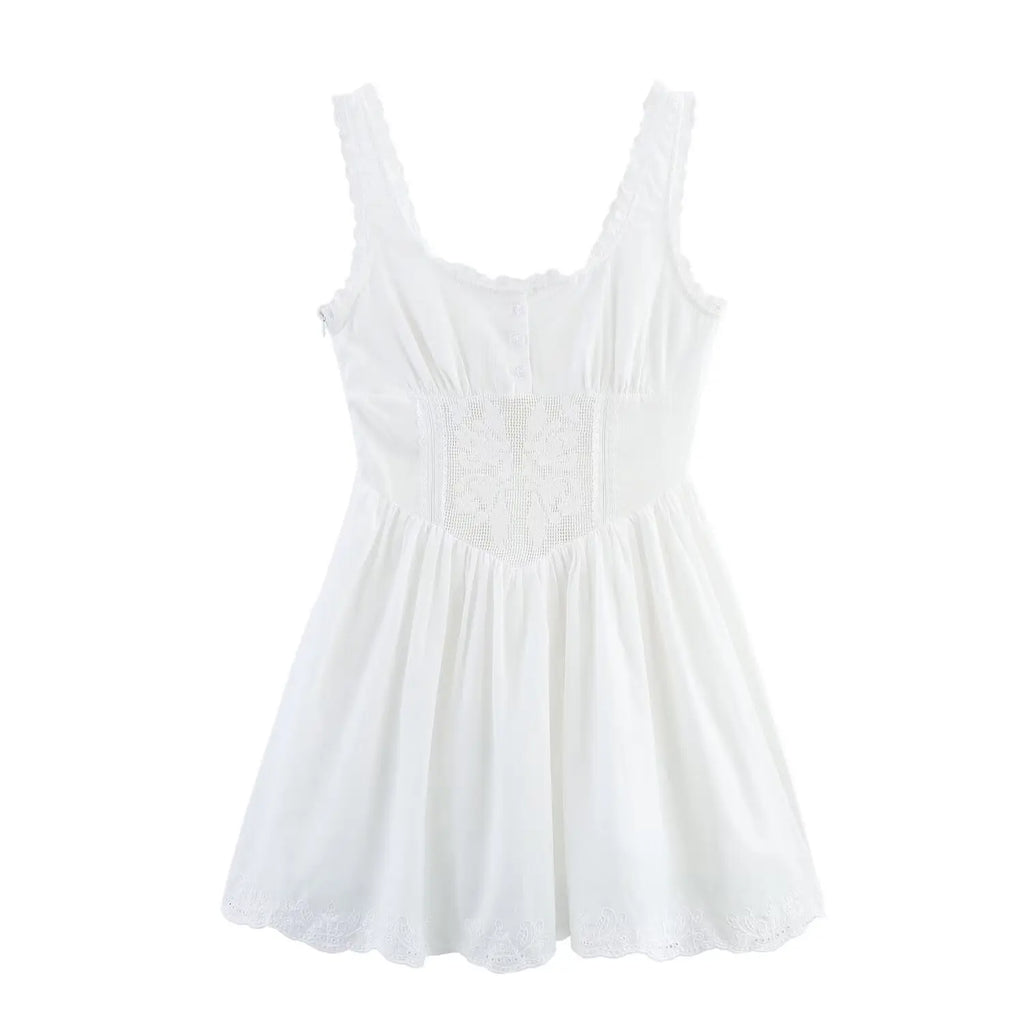 A romantic mini dress with lace-trim straps and a corset-style bodice that defines the waist, finished with a softly flared skirt for an effortlessly feminine look.