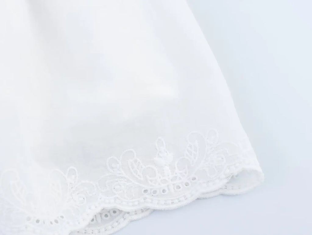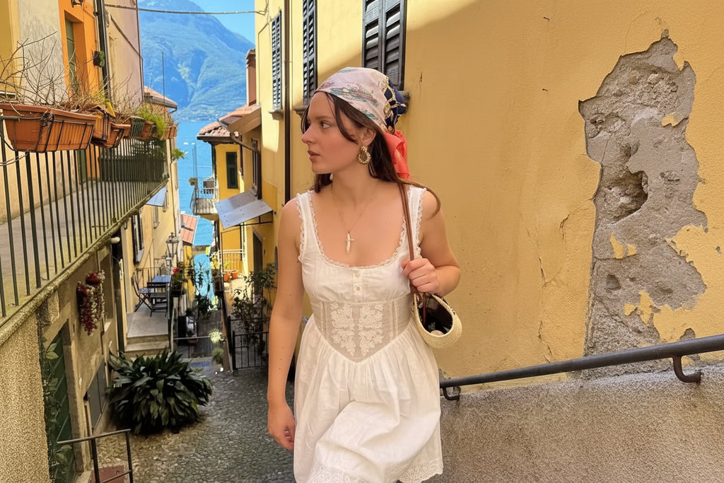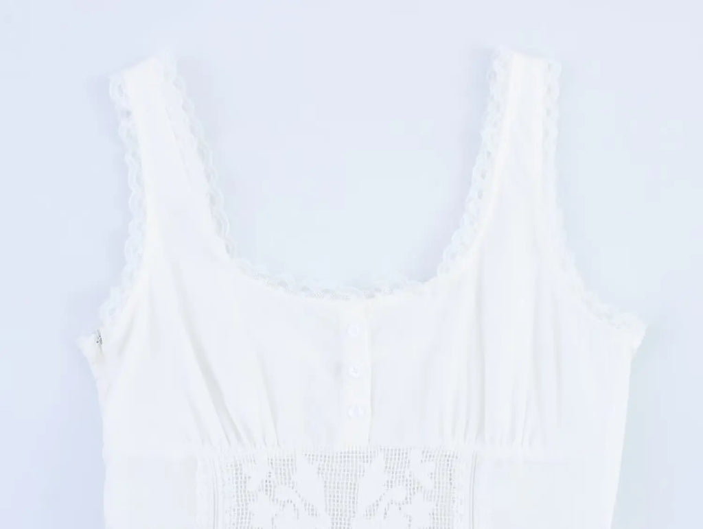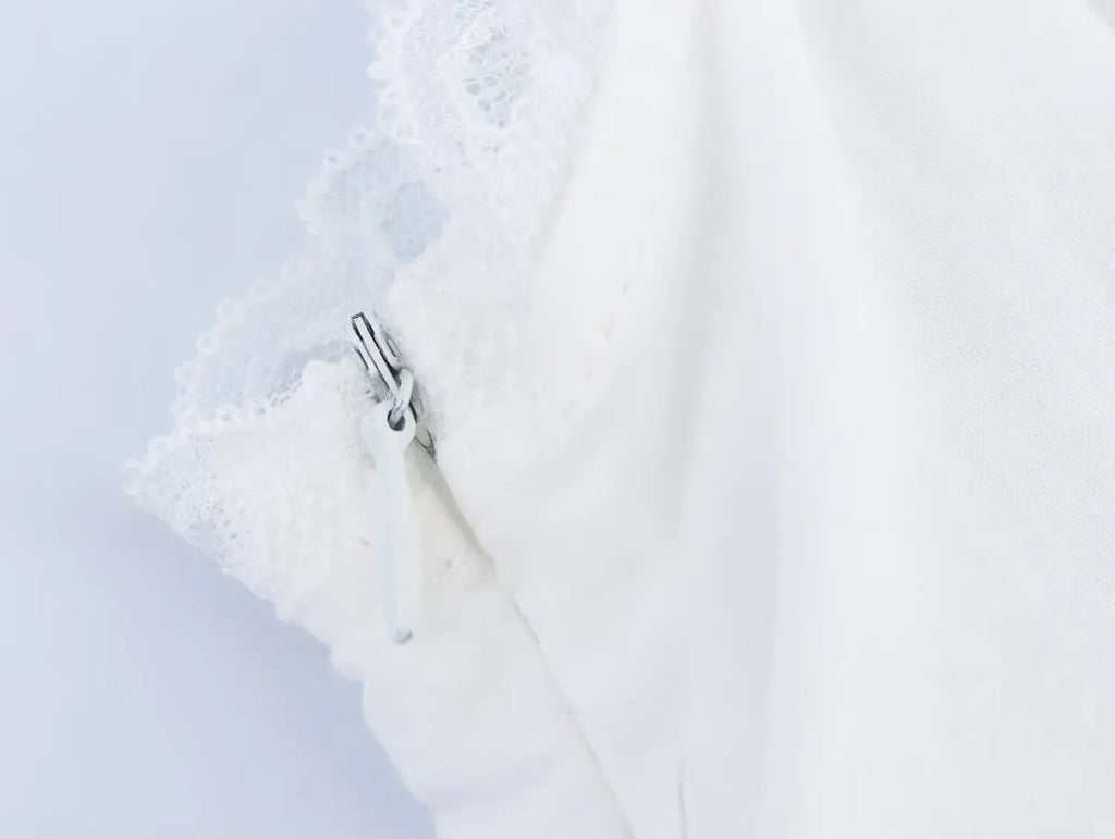 A romantic mini dress with lace-trim straps and a corset-style bodice that defines the waist, finished with a softly flared skirt for an effortlessly feminine look.