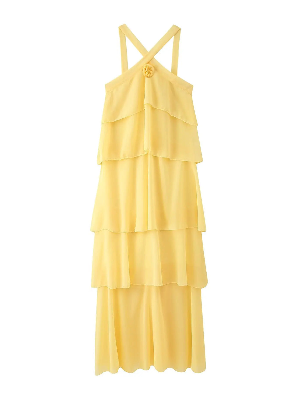 A flowing maxi dress with a rosette halter neckline and airy tiered layers that create soft movement and an effortlessly elegant silhouette—perfect for special occasions.