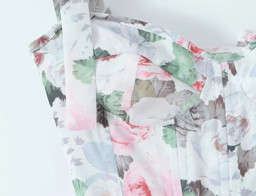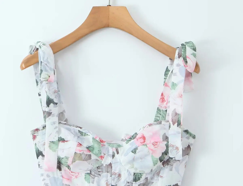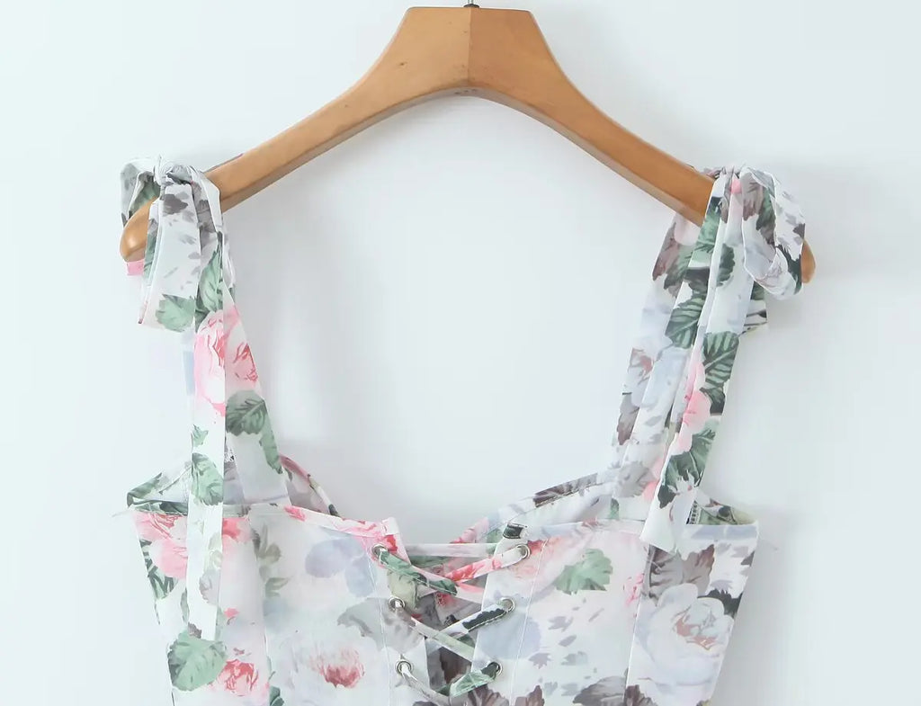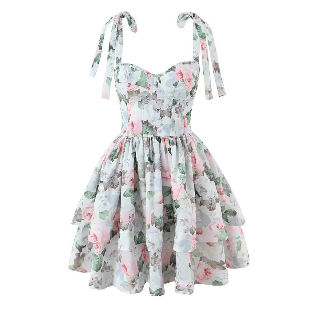 A romantic tie-strap mini dress with a structured corset bodice that cinches the waist and enhances the silhouette. The tiered skirt adds soft volume and movement—perfect for brunch, dates, and special moments.
