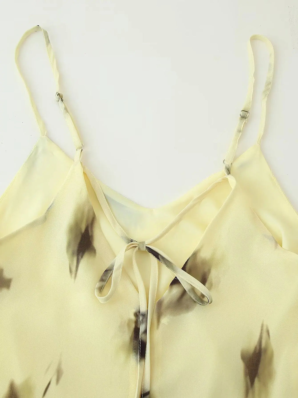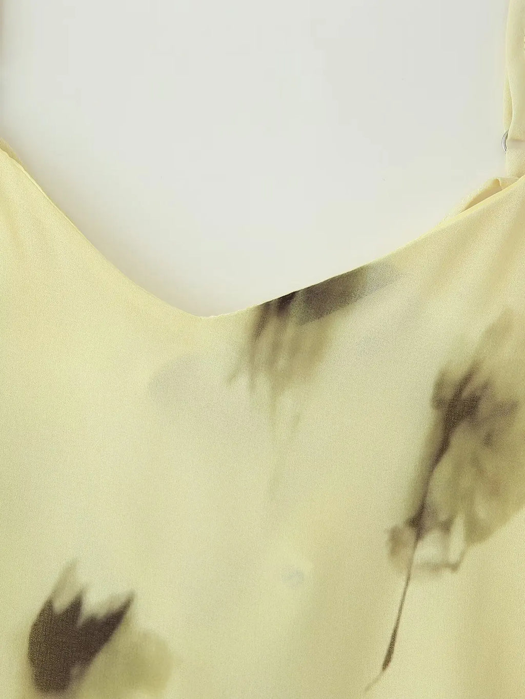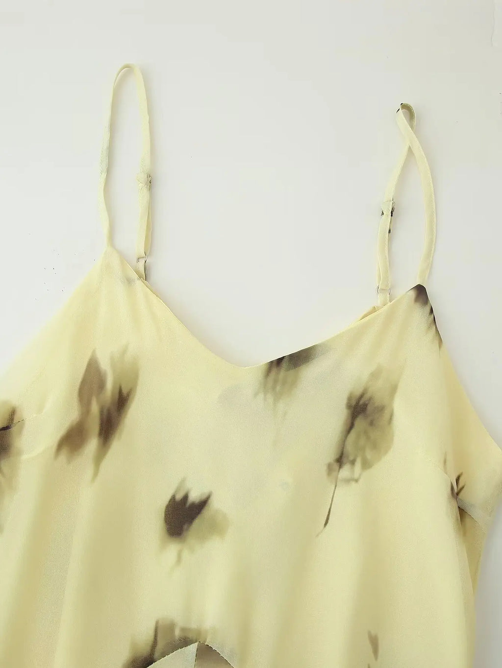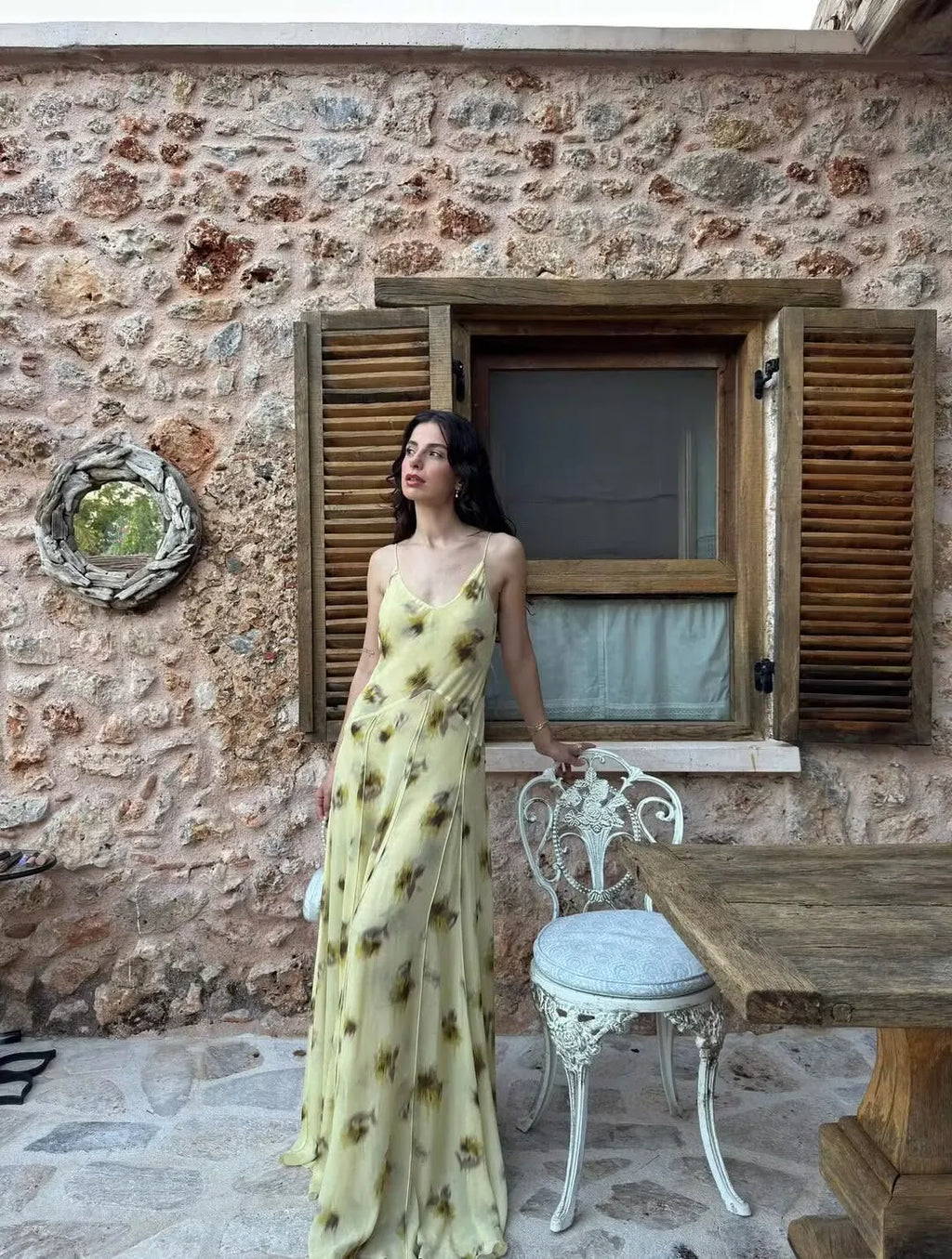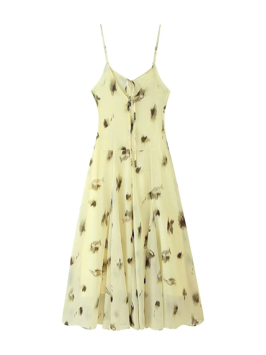 A lightweight midi dress with delicate spaghetti straps and a flattering A-line silhouette, designed to flow effortlessly with every step for an elegant, feminine look.